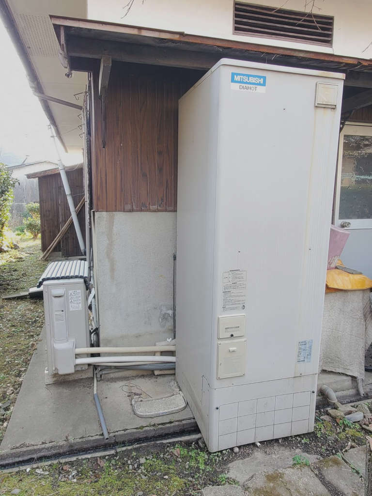 長年使っていた旧式エコキュートに不具合が頻発する様になったとの事でお電話をいただき、三菱製新型エコキュートへの交換を承りました。