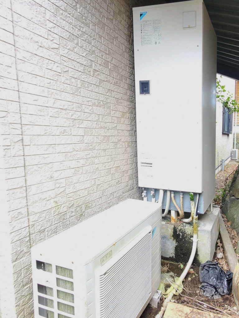 現地調査の後、漏水を起こしており、修理より買い替えが安くつきそうな状態でしたので、当社で在庫を保有していた日立製エコキュート“BHP-F46UU”をお買い上げいただき、交換工事を承りました。
